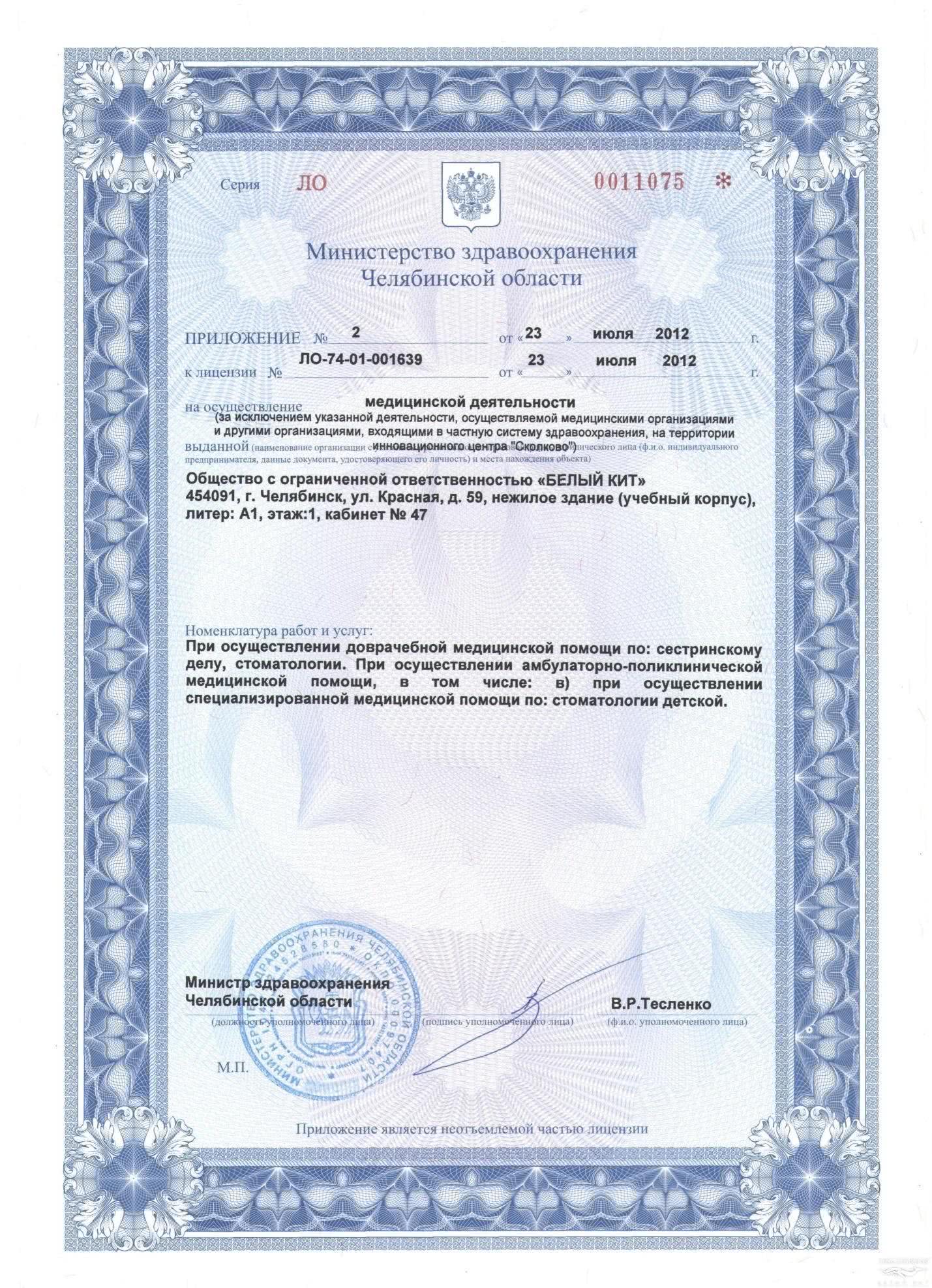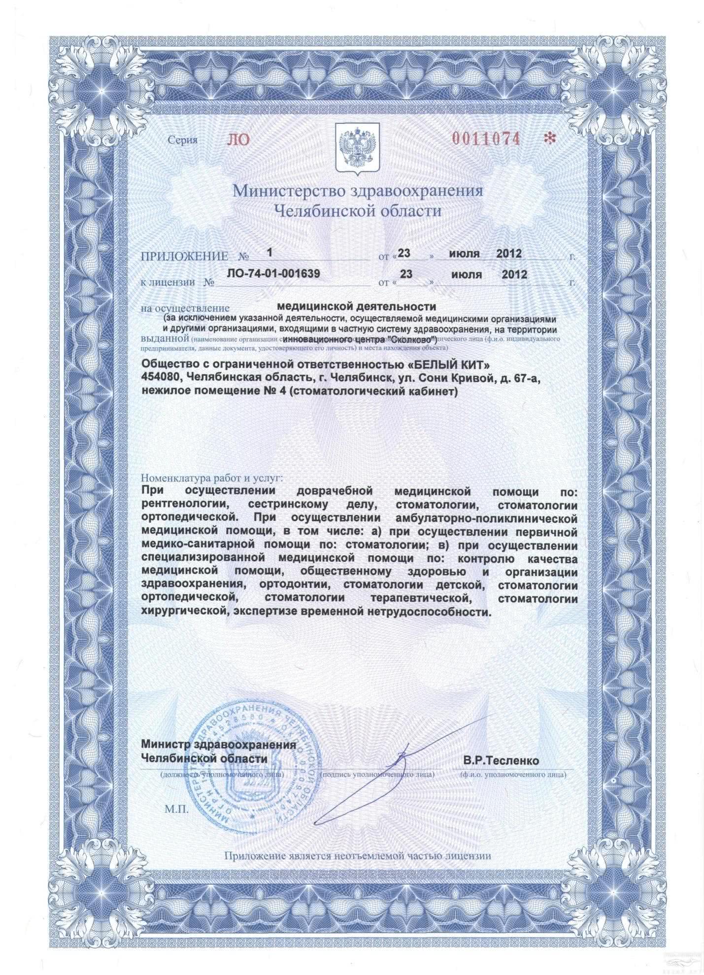 «Белый Кит» в Челябинске — это целый стоматологический комплекс. Мы создали стоматологическую клинику «Белый Кит» для взыскательных людей с особыми требованиями к качеству, комфорту и сервису. Для пациентов, ценящих свою индивидуальность, красоту и здоровье, держащих руку на «пульсе времени». Мы на рынке стоматологических услуг уже более 19 лет. Доверие пациентов – одна из самых главных ценностей компании. «Белый Кит» - клиника, которую рекомендуют. Выход на такой уровень оказания услуг был бы невозможен без значительных вложений в совершенствование профессионализма врачей, освоение передовых технологий, использование новейших материалов. Мы считаем, что наша первоочередная задача – полное восстановление стоматологического здоровья наших клиентов, мотивация на профилактический подход к организму в целом, и зубам в частности. Наша миссия — собственным примером повышать уровень стоматологических услуг в Российской Федерации, каждый день создавая новое качество жизни и здоровья людей. Главный принцип работы - поддержание высокого уровня качества. Наше качество стоит на трех китах: технология, персонал, сервис. Наша задача - опираясь на природные силы, передовые технологии медицины поддерживать и укреплять жизненный ресурс зубов.